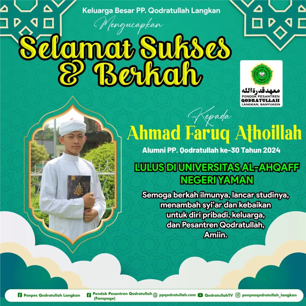 Selamat Sukses & Berkah kepada ananda Ahmad Faruq Athoillah, alumni PP. Qodratullah Langkan yang telah dinyatakan LULUS masuk Universitas Al-Ahgaff Negeri Yaman. Doa dan berkah di setiap proses yang dijalani, karena ananda adalah kebanggaan Pondok Pesantren Qodratullah..